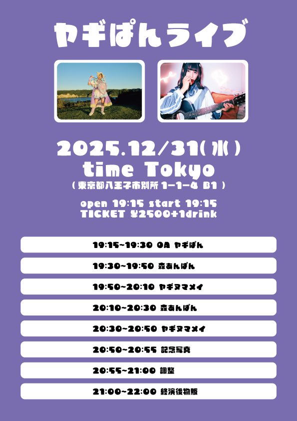 2025.12/31(水) 『ヤギぱんライブ』 📍Time Tokyo (東京都八王子市別所1-1-4 B1)開催のお知らせ