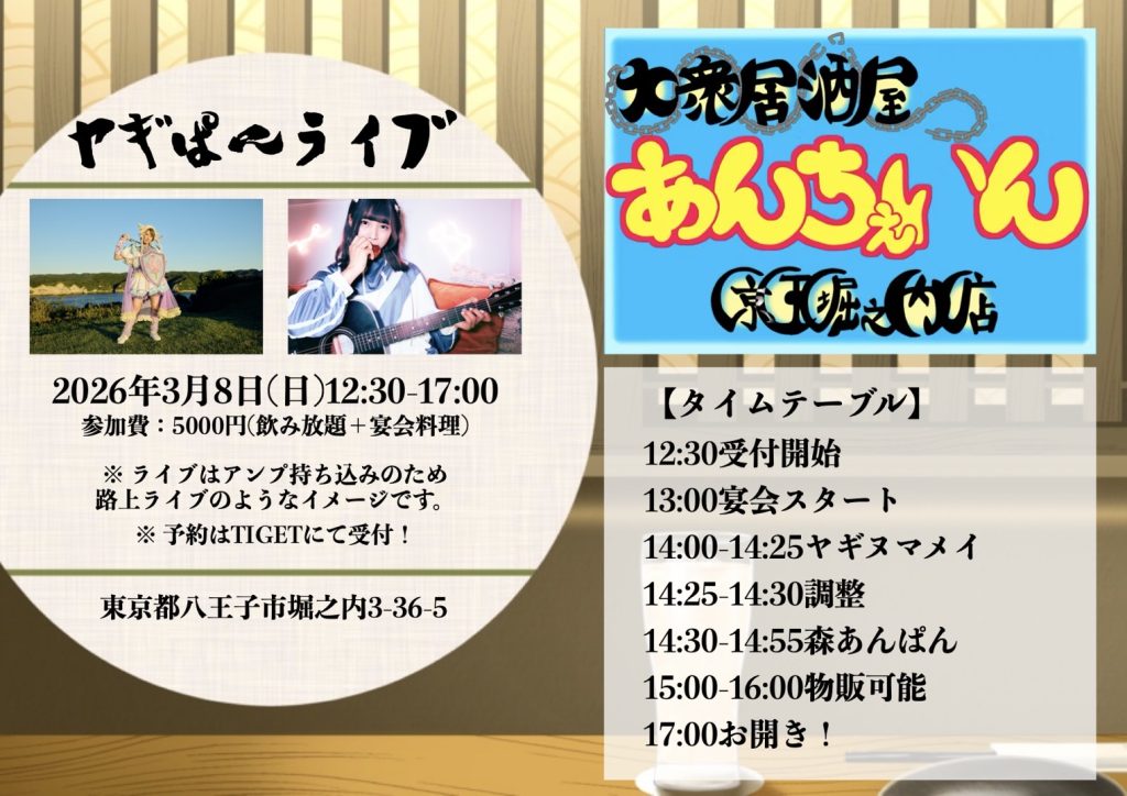 2026/3/8(日)京王堀之内あんちぇいん、ヤギぱんライブ開催のお知らせ